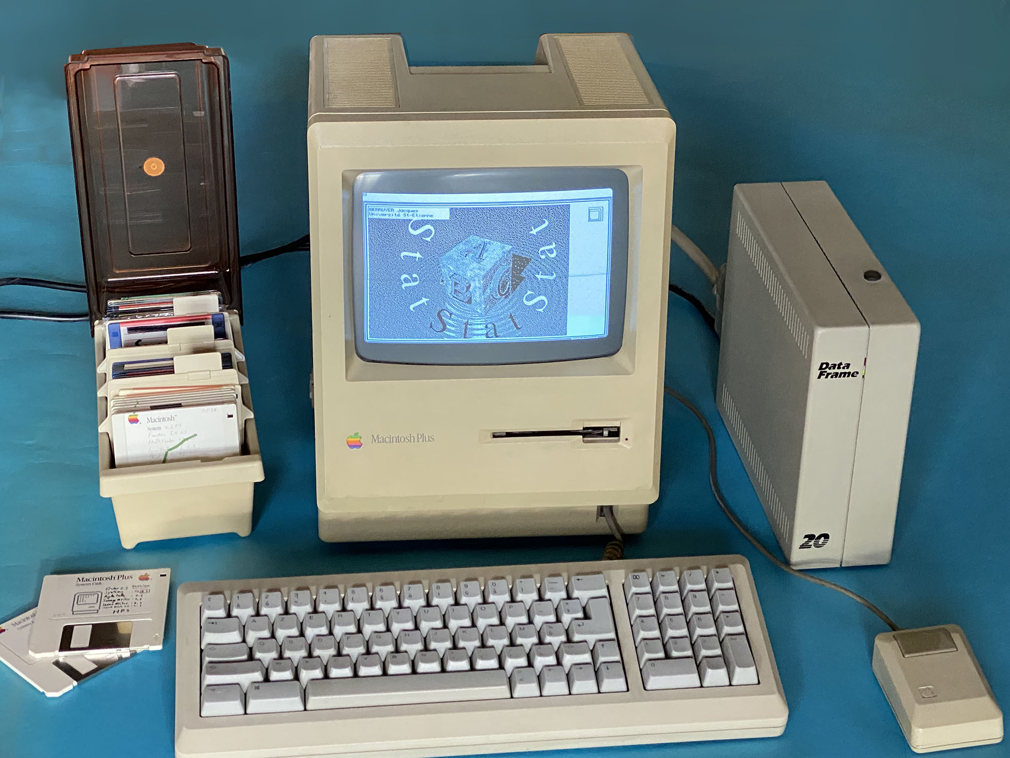 Apple Macintosh Plus (1986) still working. Note the "enormous" 20 Mb external hard drive.