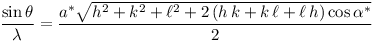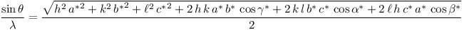 The STLmonoclinicC function returns the value Sin(Theta)/Lambda = 1/2.d[hkl] in Å-1 for the reflection [h, k, l] of a monoclinic system (c-unique setting). a, b and c are the lengths of the cell edges in Å and gamma is the interaxial angle in degrees (≠90°). The expression is extracted from the International Tables for Crystallography (Vol. C).