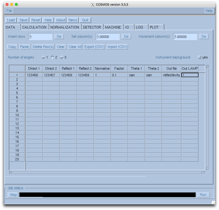 Calculation method: Here you can choose to add foreground intensities along lines of constant wavelength, which is the right choice if the sample is flat and the incoming beam divergence is higher than the detector resolution (incoherent method), or you can choose to add foreground intensities along lines of constant qz, which is the right choice if the sample is bent or the detector resolution is higher than the incoming beam divergence. In any case COSMOS will warn you in hte log tab if you have choosen an inapropriate method. Details can be found in: Cubitt et al., J. Appl. Cryst. 48, 2006-2011 (2015).
