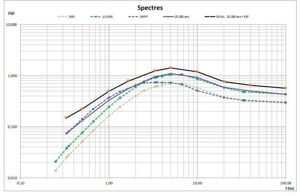 Ce calcul est effectué selon la méthode préconisée par la RFS 2001-01 et en tenant compte des effets de site, c'est-à-dire des effets d’amplification du mouvement du sol dus au remplissage sédimentaire de la cuvette grenobloise. Il s’agit de calculs de «spectres de réponse en accélération» : ils donnent le niveau d’accélération maximum généré par le séisme en fonction de la fréquence des mouvements du sol. En faisant ce calcul, on s’aperçoit que le séisme le plus pénalisant à retenir est celui de Corrençon. D’autre part, le niveau d’accélération du Séisme Majoré de Sécurité (SMS) est environ 1,5 fois plus élevé que celui du SMHV.