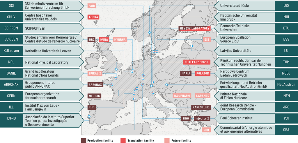 A network of world-leading European facilities, including nuclear reactors, medium- and high-energy accelerators, and radiochemical laboratories, has been established to offer the broadest catalogue of radioisotopes for medical research. Mass separation is available at the CERN MEDICIS facility to provide the physical separation of the isotopes of an element. This is supported by a network of biomedical research facilities which can host external researchers, allowing them to perform their research close to the production facility in situations where the isotopes are not suitable for long haul transport to their institution, or when the European licence for the novel radioisotopes has not yet been obtained.