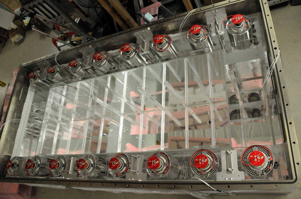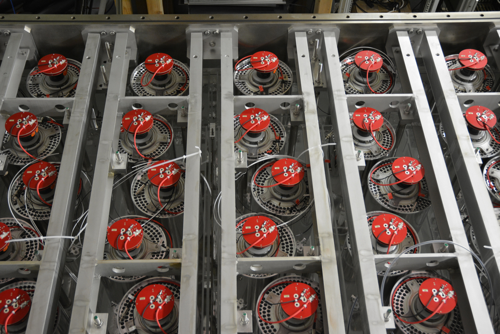 Top view the detector cells with all photomultipliers and associated electronics (red disks) installed.