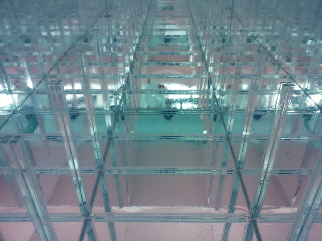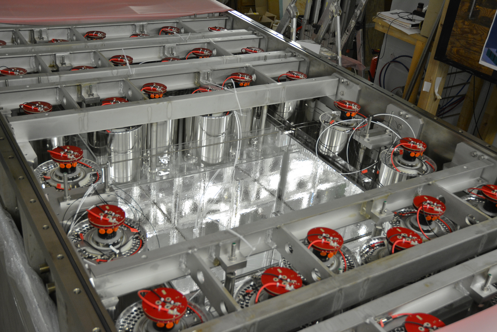 Inner detector volume almost fully equipped. Only one of the target cell is missing its photomultipliers, allowing the see the reflective walls.